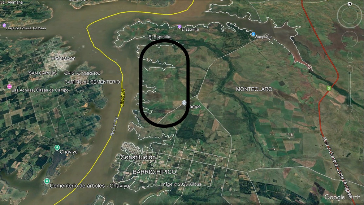 ---Corta distancia al Sur de la intersección con la costa Río ARAPEY y al Este costa al Río URUGUAY